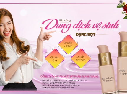Thanh Trang Cosmetic nhận gia công các sản phẩm chăm sóc kín đáo theo yêu cầu của quý khách hàng. Mọi yêu cầu thay đổi về hình thức gia công (bán thành phẩm và thành phẩm trọn gói), thành phần, màu sắc, mùi hương, kết cấu sản phẩm,... đều sẽ được đáp ứng. Không những thế, quý khách hàng sẽ được hỗ trợ tối đa về thiết kế bao bì, hồ sơ pháp lý, giới thiệu đơn vị cung cấp chai lọ bao bì uy tín,... và hoàn toàn yên tâm, tin tưởng khi thực hiện gia công sản xuất.